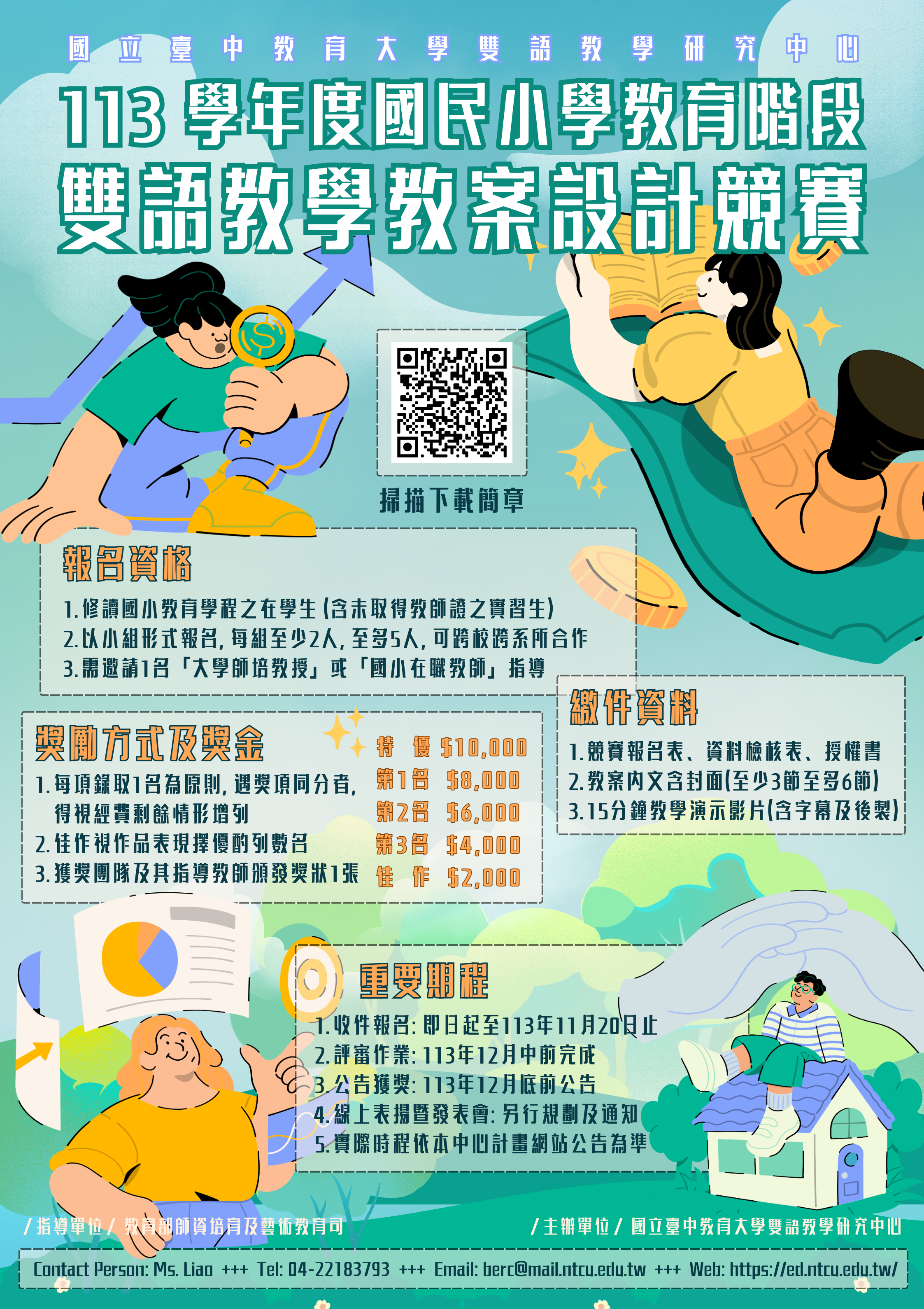 | 講座&活動 | 雙語教學研究中心辦理「113學年度國民小學教育階段雙語教學教案設計競賽」 | 活動海報 競賽辦法 競賽辦法 |