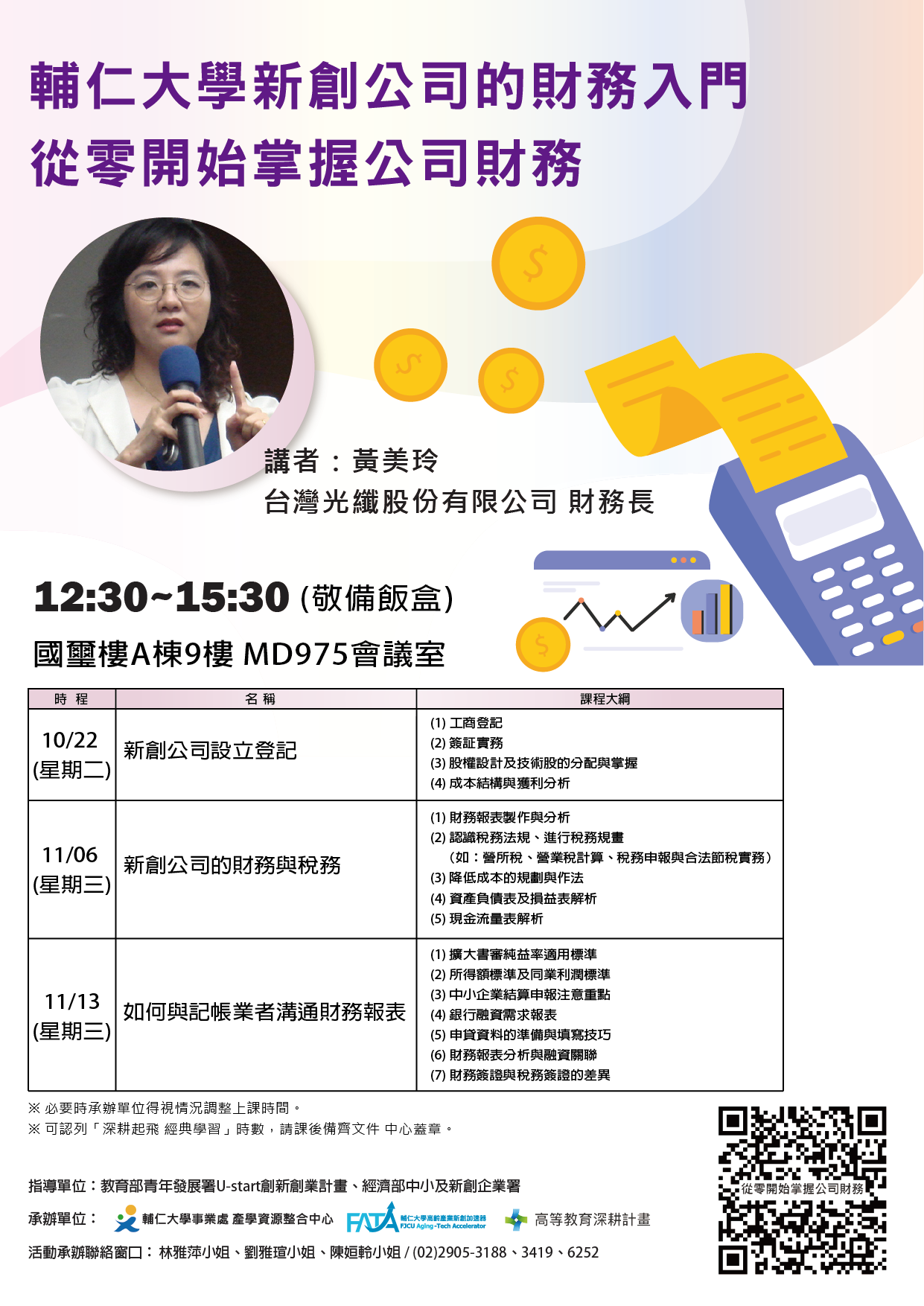 | 講座&活動 | 轉知輔仁大學學校財團法人輔仁大學「新創公司的財務入門-從零開始掌握公司財務」課程簡介,歡迎轉知所屬師生線上報名參加 | 海報 來函 |