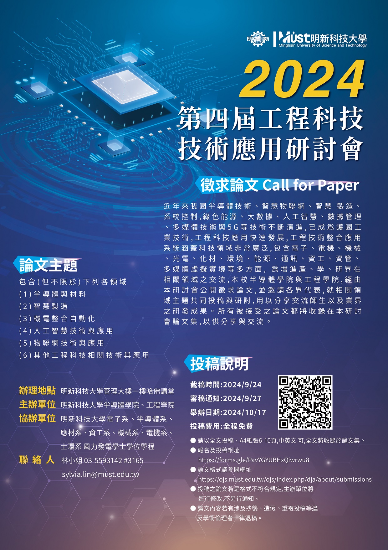 | 講座&活動 | 轉知明新科技大學113年第四屆工程科技技術應用研討會徵稿訊息,請查照。 | 海報 來函 |