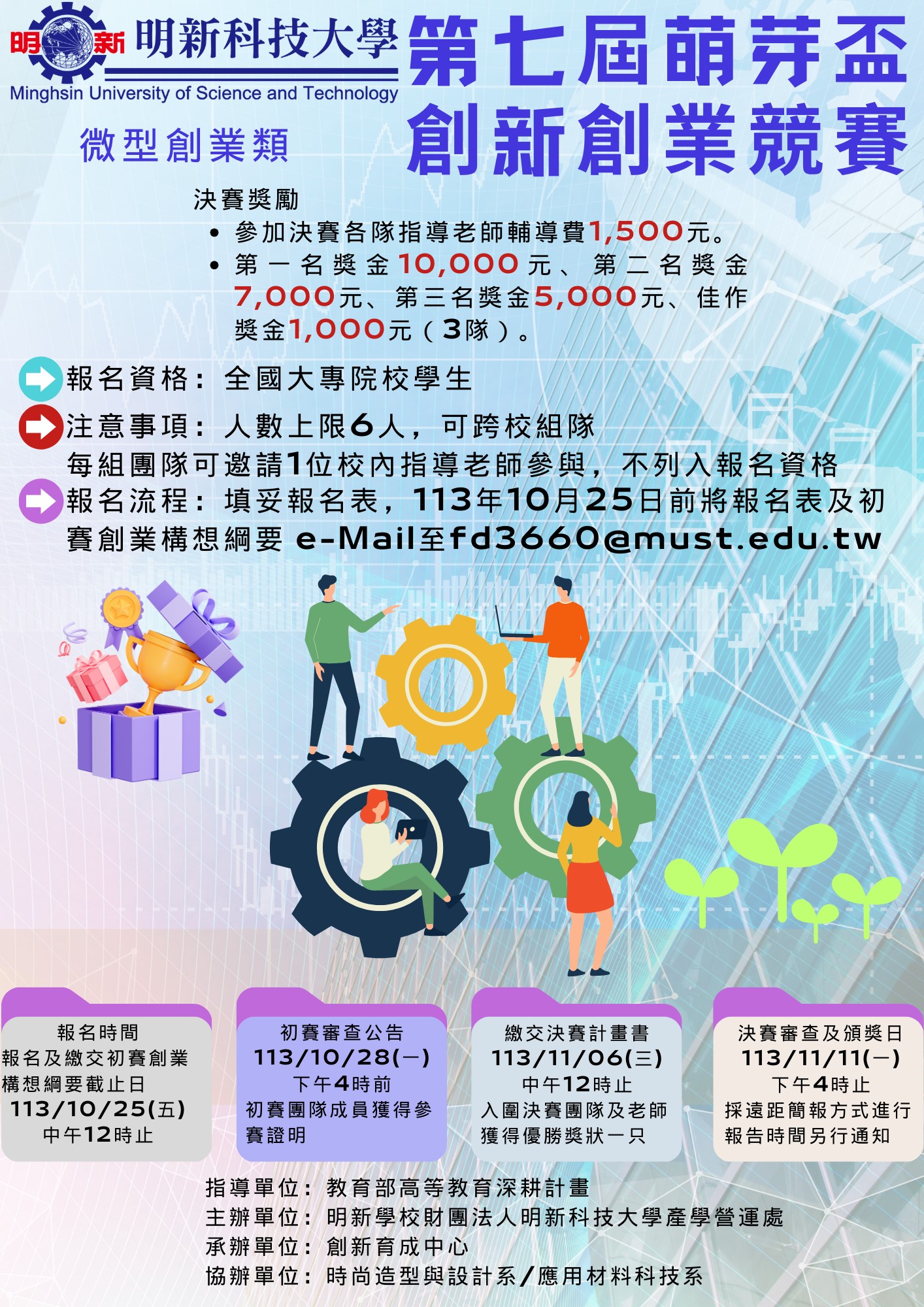 | 講座&活動 | 轉知 明新學校財團法人明新科技大學辦理「第七屆萌芽盃創新創業競賽」,敬請惠予協助公告並鼓勵全校師生團隊踴躍報名參加 | 說明 海報 |