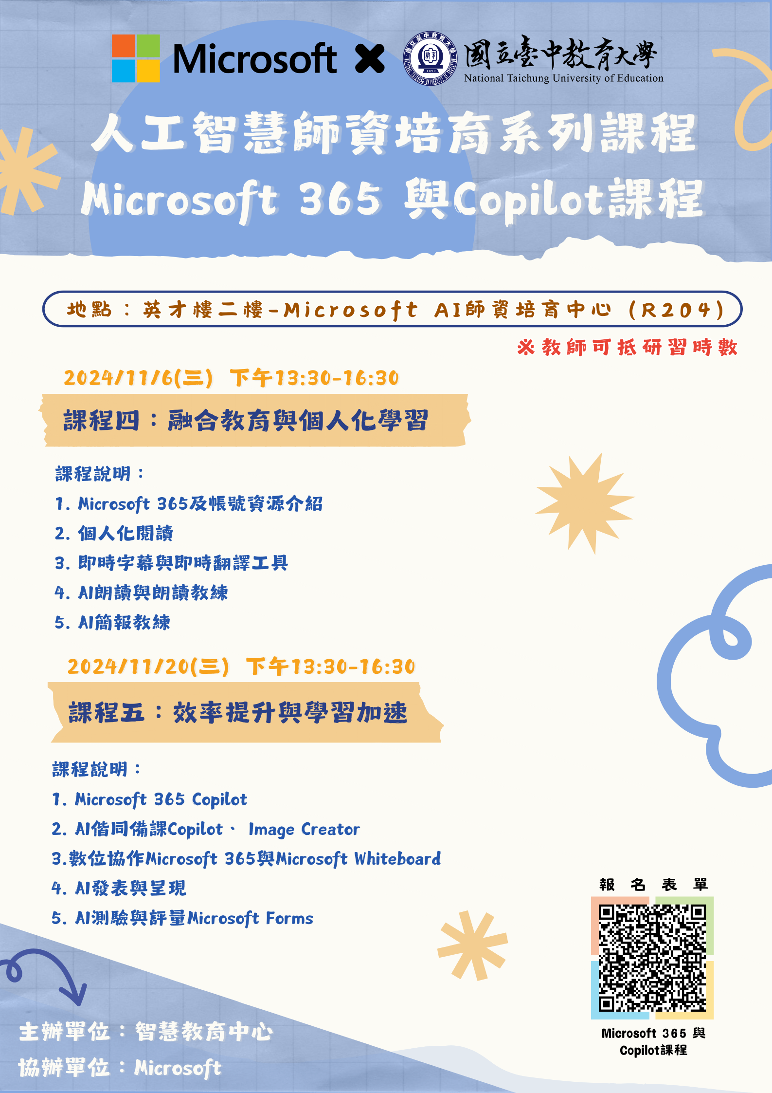 | 講座&活動 | 轉知 本校智慧教育中心與Microsoft合作辦理「人工智慧師資培育系列課程-Microsoft 365與Copilot課程」,敬邀本校師生報名參加 | 海報 |