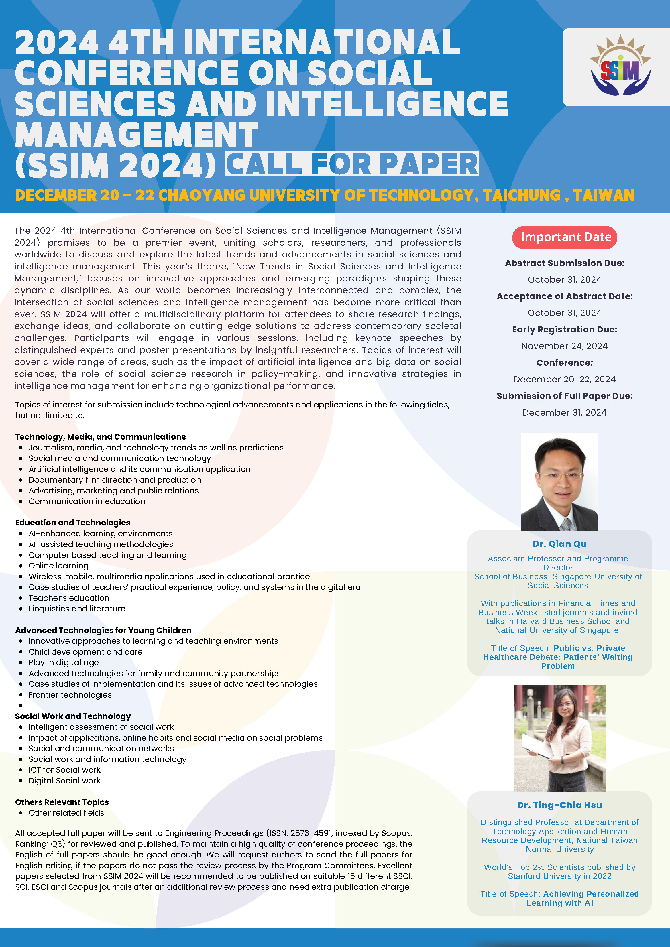 | 講座&活動 | 轉知 朝陽科技大學訂於113年12月20-22日辦理「第4屆社會科學與智慧管理國際研討會(SSIM 2024)」,摘要徵稿期限延長至113年10月31日,歡迎本校師生踴躍投稿參加 | 海報 |