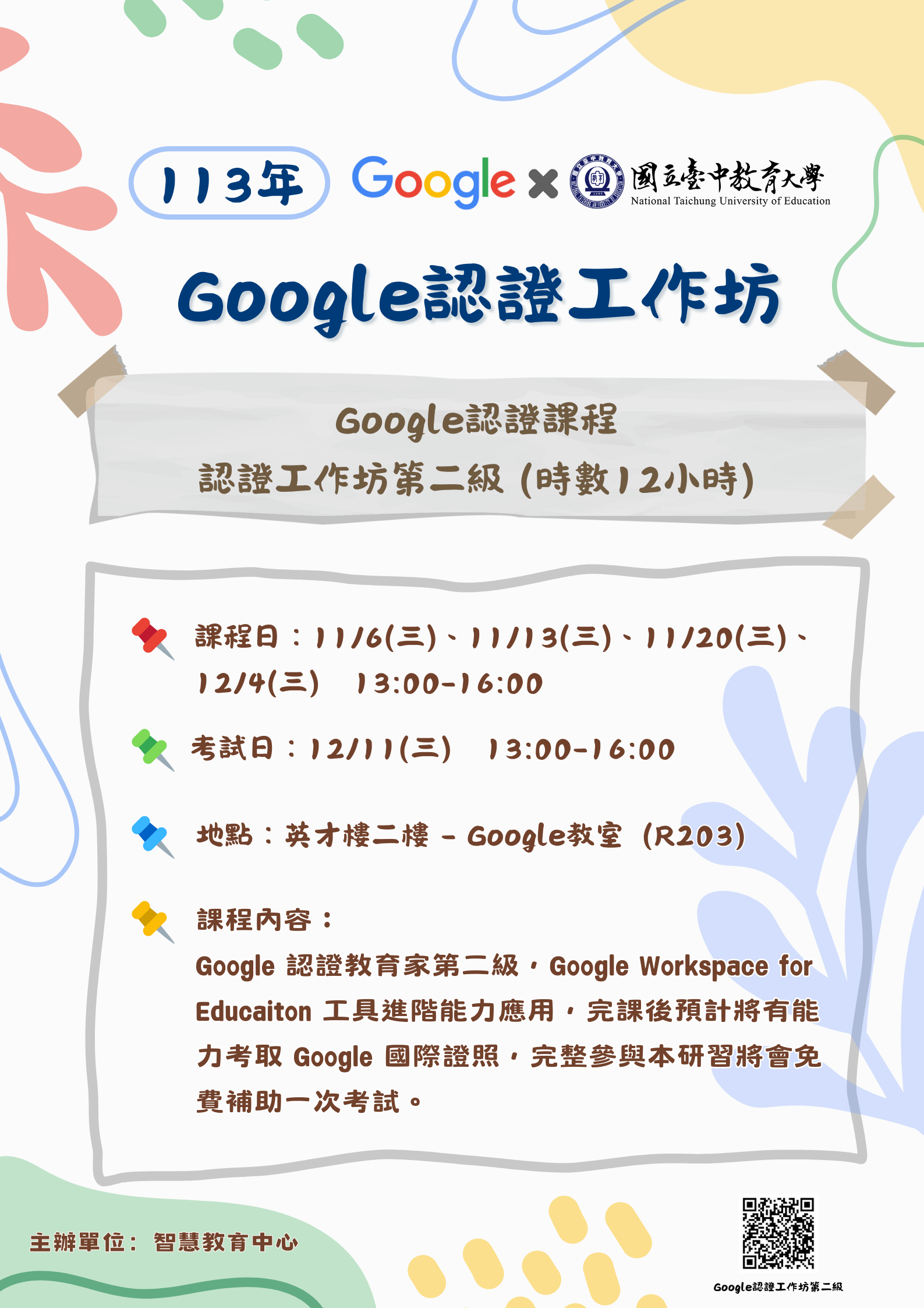 | 講座&活動 | 轉知 本校智慧教育中心與Google合作辦理「Google認證課程第二級工作坊」,敬邀本校師生報名參加 | 海報 |