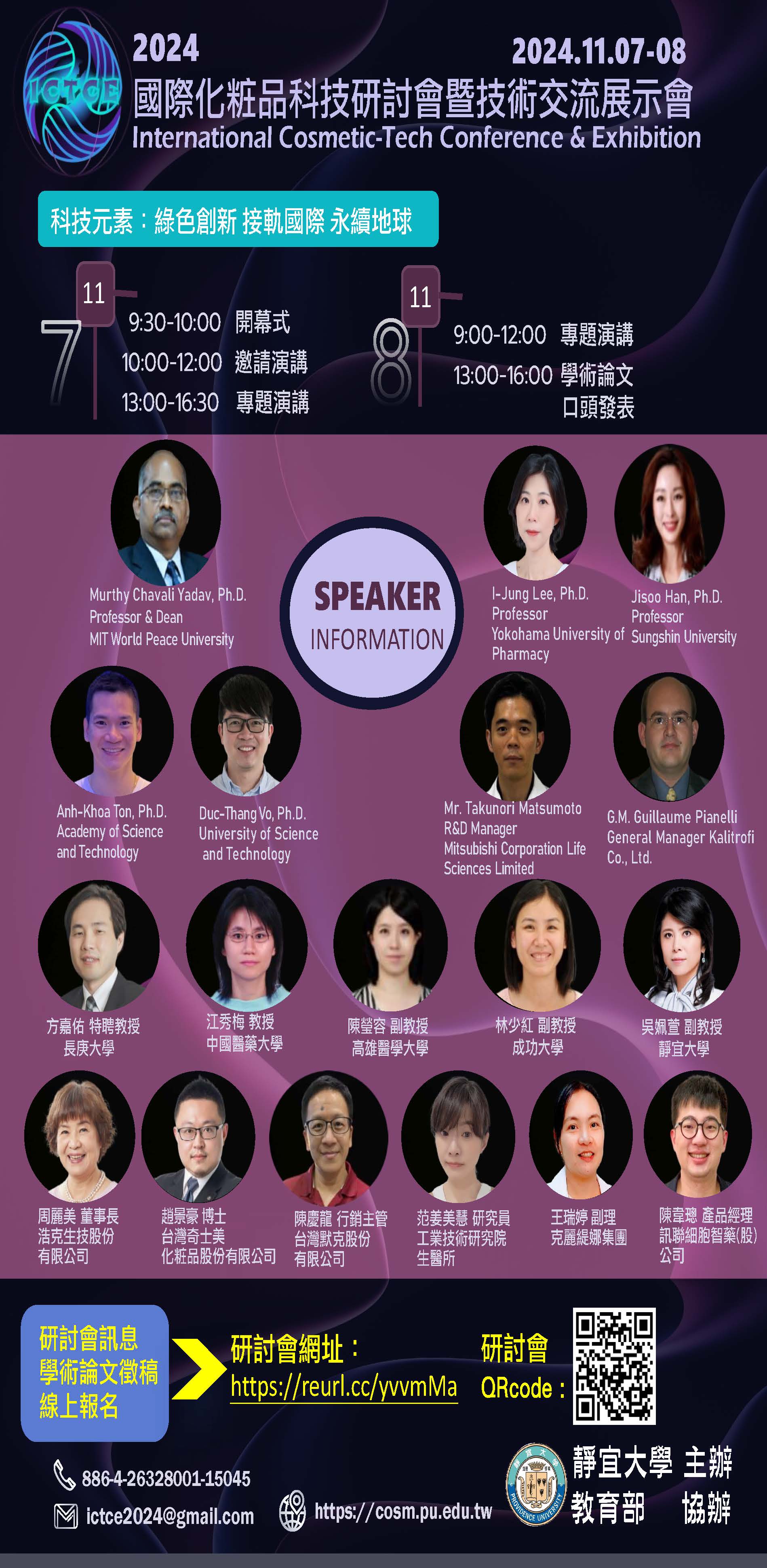 | 講座&活動 | 該校主辦「2024國際化粧品科技研討會暨技術交流展示會」活動及學術論文徵稿相關事宜,歡迎師生踴躍參加暨惠予公差假。 | 海報 來函 |